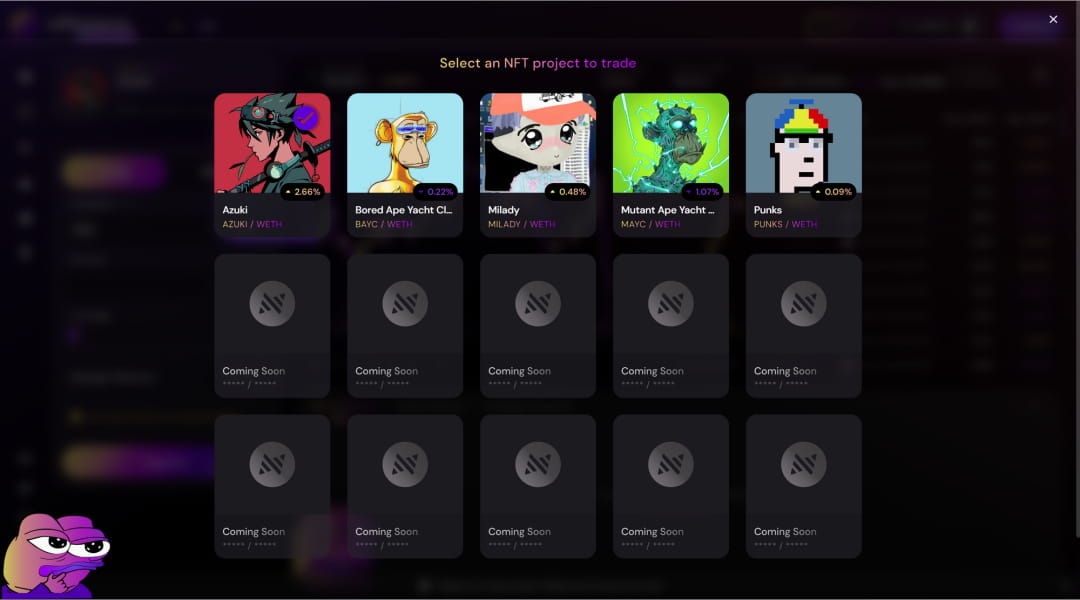NFTperp adopts the vAMM design, which does not require LP to establish a liquidity pool. Long/short traders are counterparties to each other. The beta mainnet will be launched in November 2022. The contract supports the use of ETH to trade 5 NFT series including AZUKI/BAYC/MAYC/PUNK/Milady, with a maximum leverage of 10x.