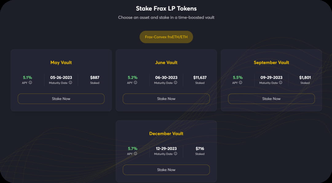 Submit/lock 10 frxETH/ETH LP tokens for 3 months and you will receive 10 frxETH/ETH TBT tokens for 3 months.