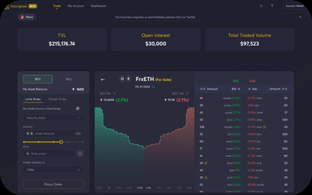 HourGlass uses an order book model to match transactions, and the subject will have different discounts depending on the length of the expiration time as compensation for the opportunity cost of time. At the same time, the transaction situation on HourGlass can also be regarded as an indicator of the DEFI protocol. The demand for time-limited tokens can reflect the liquidity situation.
