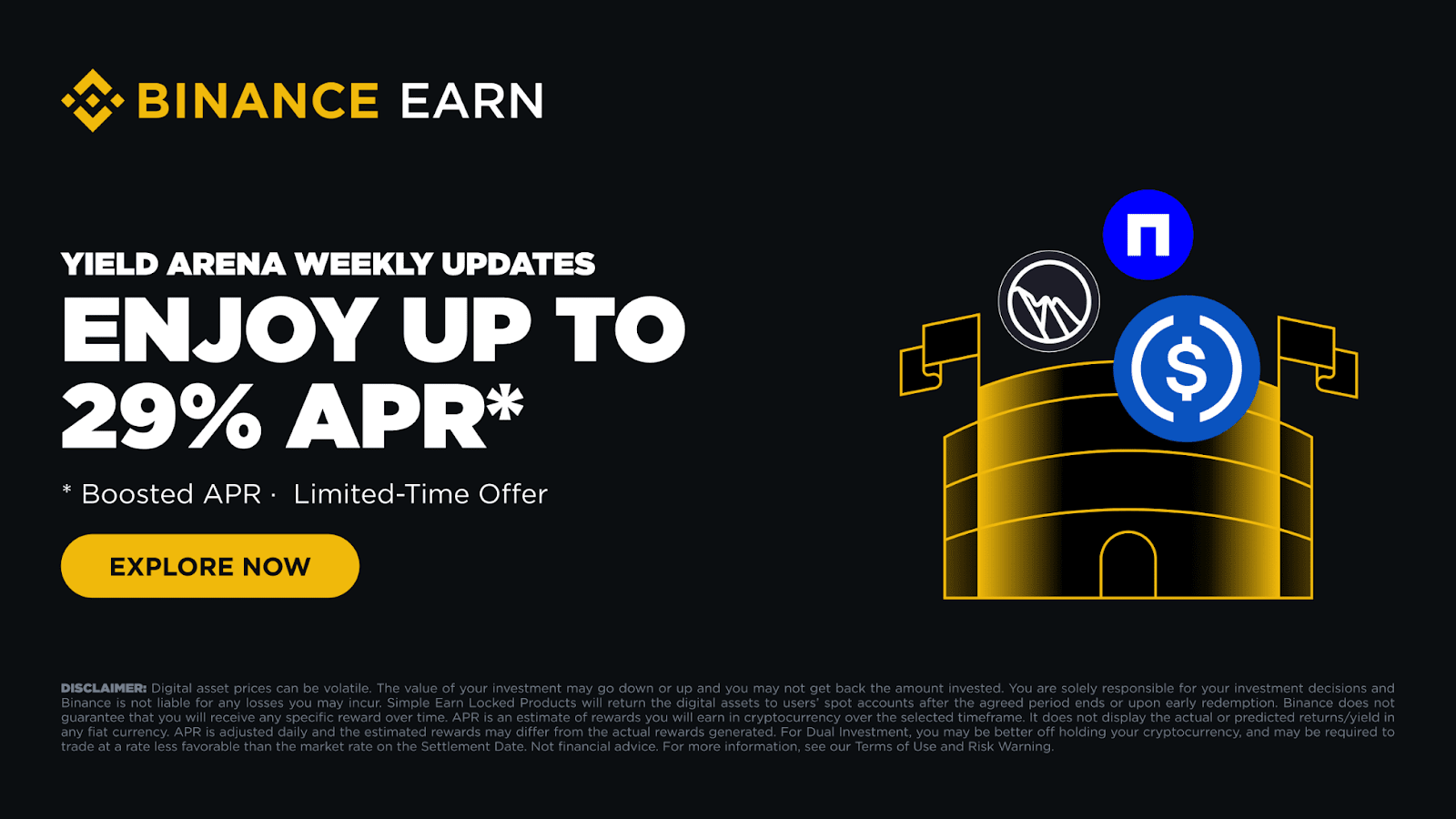 Disclaimer: Digital asset prices can be volatile. The value of your investment may go down or up and you may not get back the amount invested. You are solely responsible for your investment decisions and Binance is not liable for any losses you may incur. Simple Earn Locked Products will return the digital assets to users’ spot accounts after the agreed period ends or upon early redemption. Binance does not guarantee that you will receive any specific  reward over time. APR is an estimate of rewards you will earn in cryptocurrency over the selected timeframe. It does not display the actual or predicted returns/yield in any fiat currency. APR is adjusted daily and the estimated rewards may differ from the actual rewards generated. For Dual Investment, you may be better off holding your cryptocurrency, and may be required to trade at a rate less favorable than the market rate on the Settlement Date. Not financial advice. For more information, see our Terms of Use and Risk Warning.