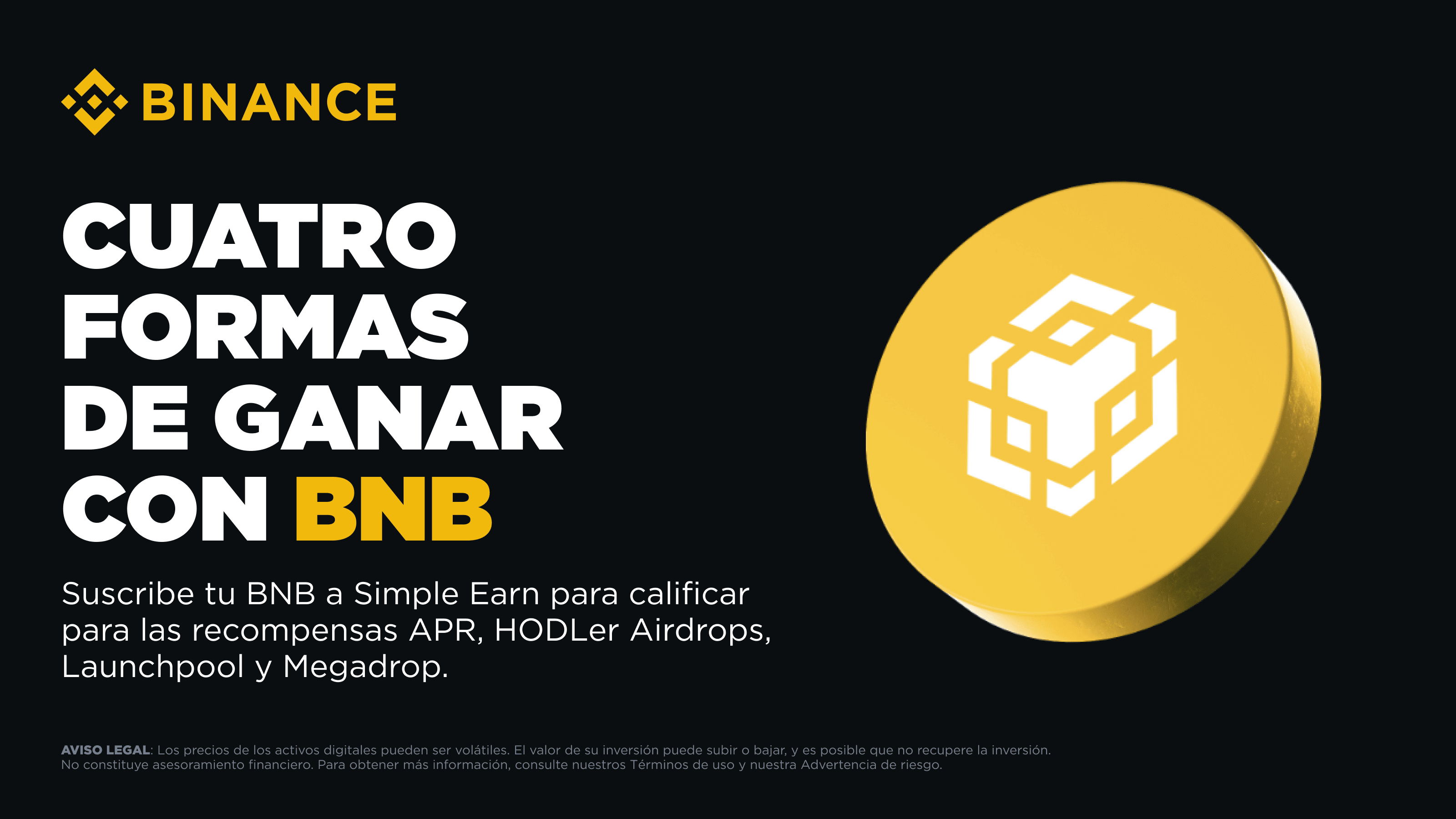 • Suscribirte con BNB a Simple Earn acumula intereses, pero también te califica automáticamente para las recompensas de Launchpool, Megadrop y HODLer sin tener que hacer nada más.