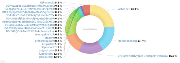 Hay docenas de grupos grandes o medianos que extraen Dogecoin. Sin embargo, sólo unos pocos grupos grandes suelen resolver la mayoría de los bloques de la red. Actualmente, los dos más grandes son ViaBTC y LitecoinPool.org.