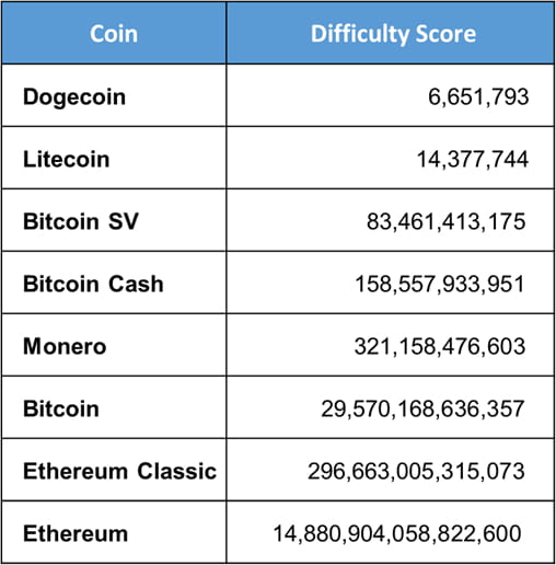 La siguiente tabla muestra los puntajes de dificultad actuales, en orden ascendente, para todas las monedas explotables en las 50 principales criptomonedas por capitalización de mercado.