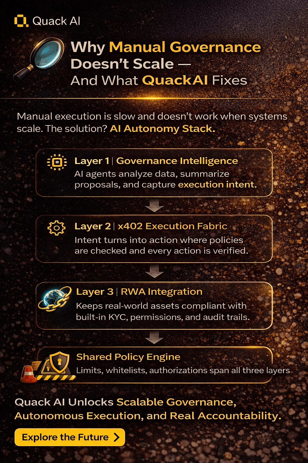Quack AI está resolviendo esto al introducir un Stack de Autonomía AI donde la inteligencia, la ejecución y el cumplimiento se mueven juntos.