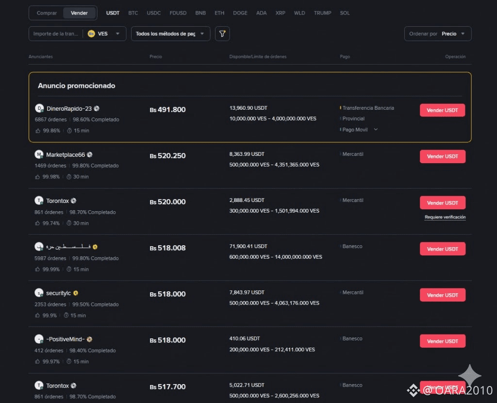 Captura de pantalla de la interfaz de Binance P2P mostrando los precios de venta de USDT a VES. Se pueden observar ofertas que rondan los 520 Bs por USDT, así como un anuncio promocionado a un precio inferior.