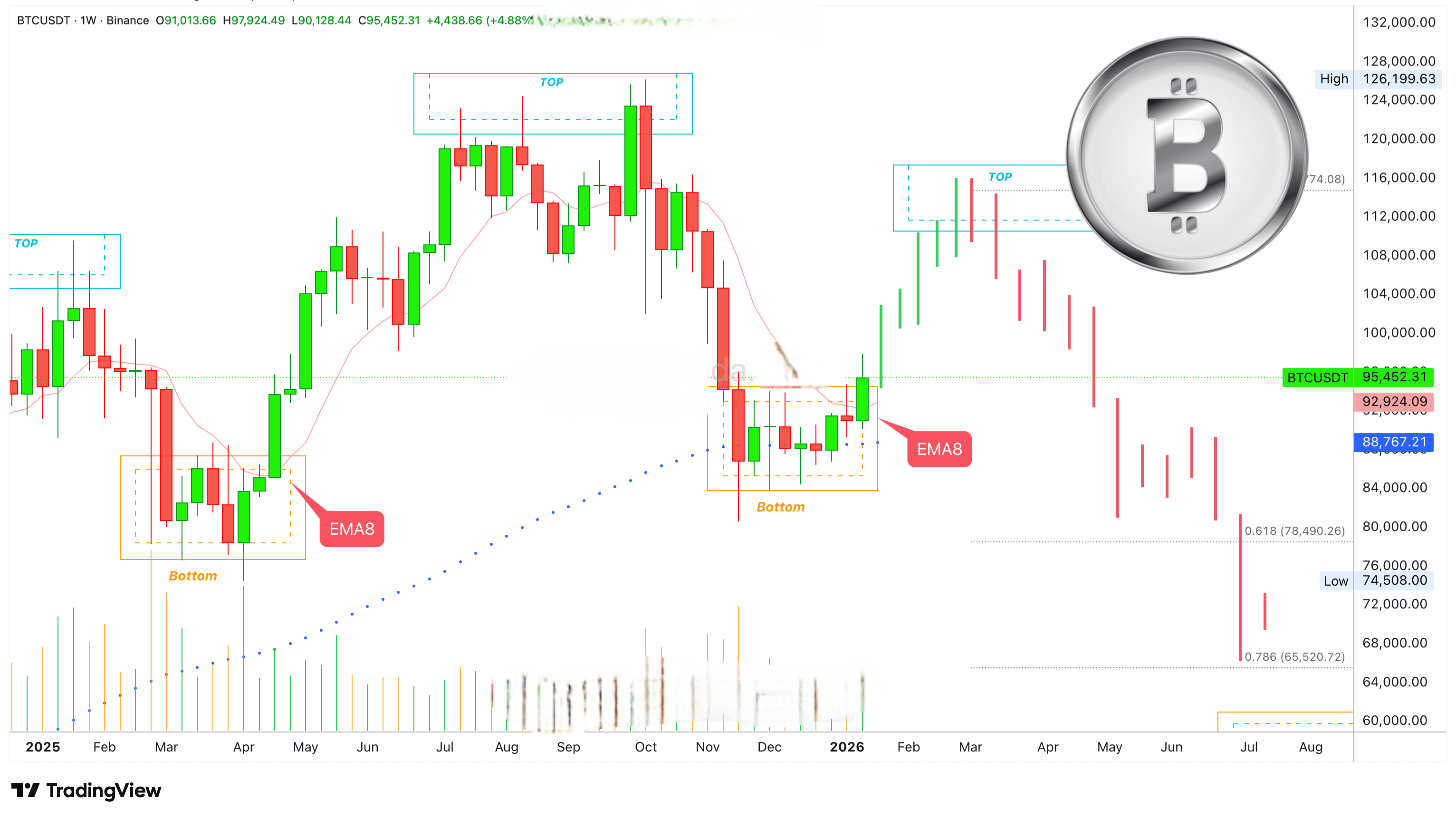 La semana del 21 de abril de 2025, Bitcoin superó la EMA8. En el momento en que esto sucedió, tuvimos una fuerte ola alcista. En la actualidad, hemos estado esperando y anticipando esta ola durante casi dos meses y finalmente ha llegado. Cuando la acción se vuelve alcista, aunque estábamos esperando una ruptura alcista, nunca es el final, sino simplemente el comienzo.