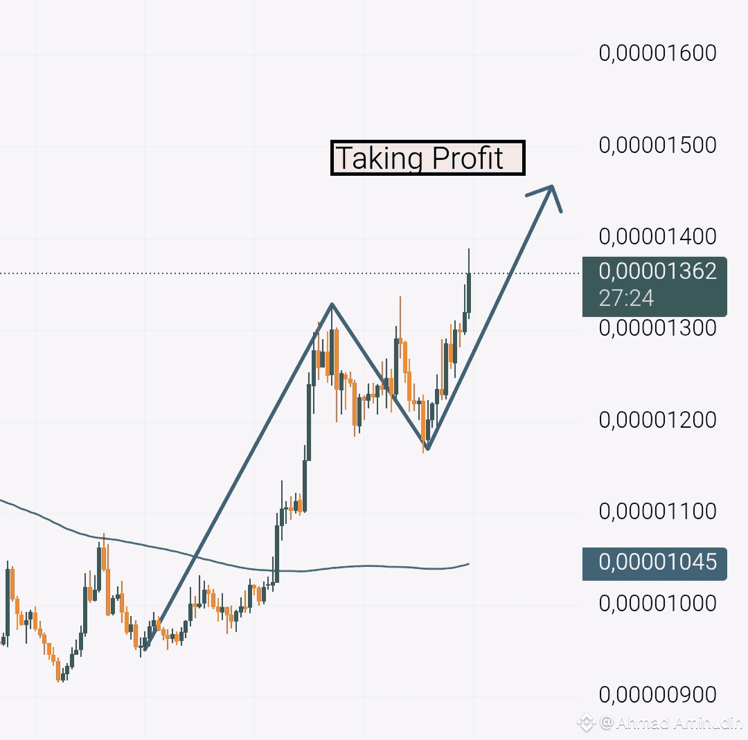 My personal game plan is locked in. I'm seeing a clear path upwards, and I've set my take profit target around the 0.00001500 zone. It feels like the rocket is fueled and ready for launch. Is PEPE going to the moon? This chart makes me think so!