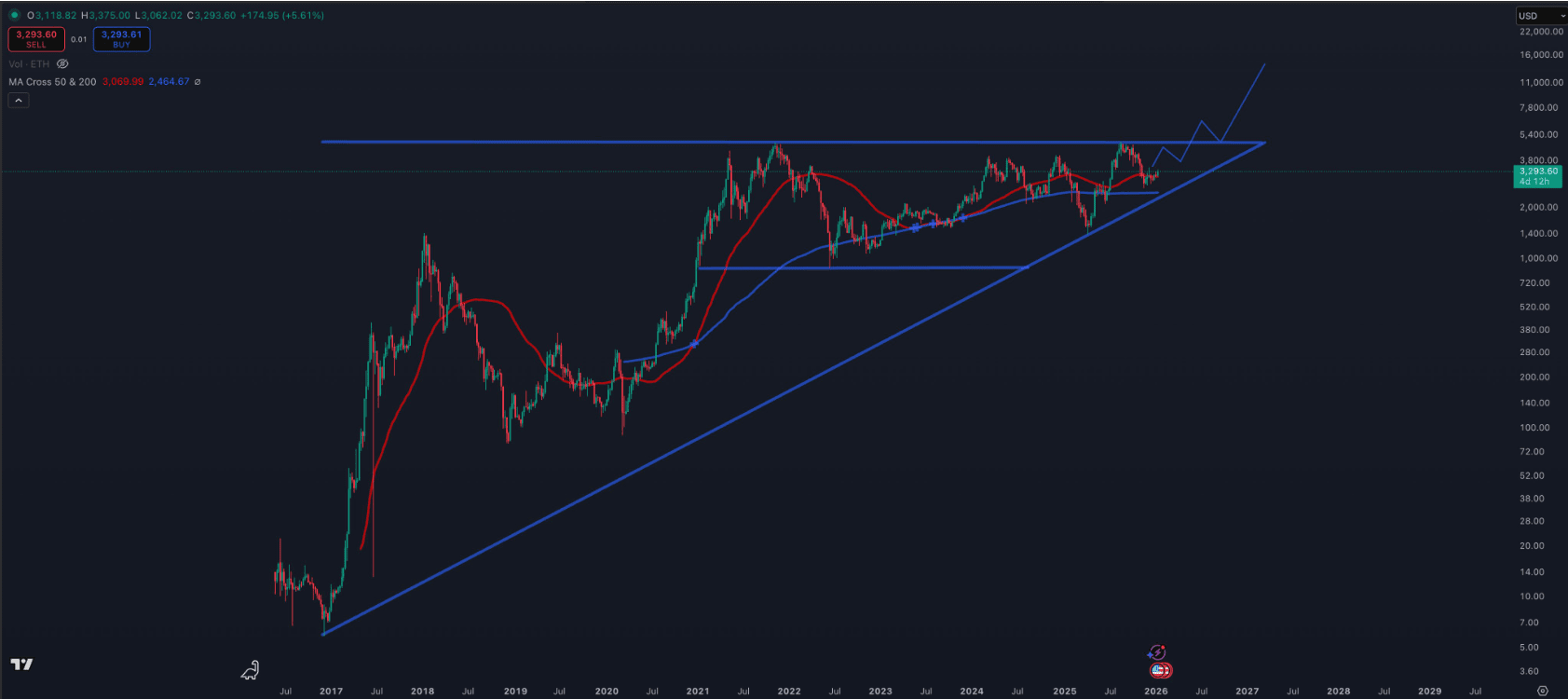 $ETH Ethereum évolue au-dessus des moyennes mobiles hebdomadaires critiques de 50 et 200 à 3 200 $-3 300 $, signalant une impulsion haussière continue et un potentiel test des anciens plus hauts historiques.