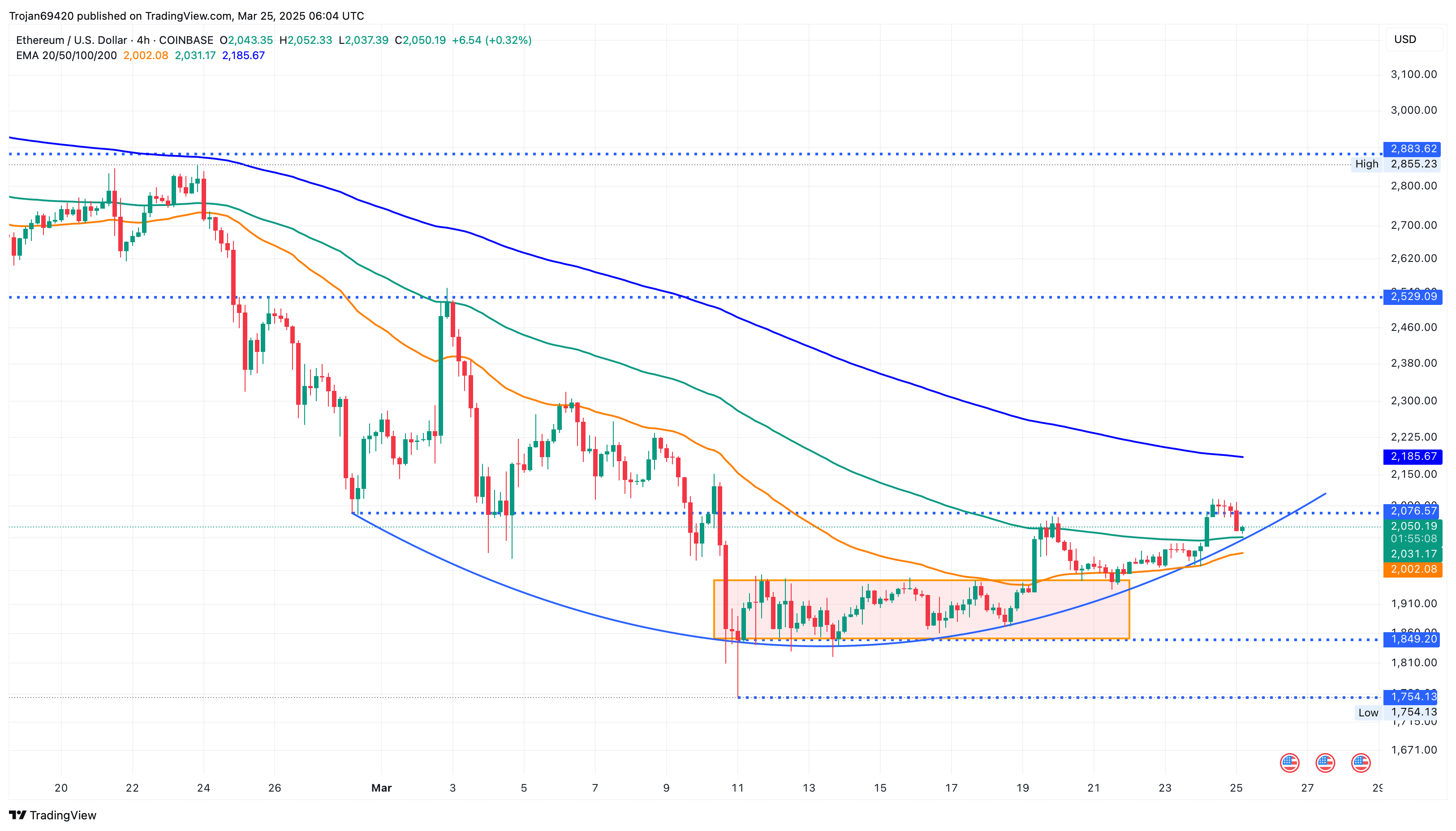 Pada grafik 4 jam, aksi harga Ethereum menunjukkan reli pembalikan, keluar dari fase konsolidasi. Cryptocurrency ini naik dari sekitar $2.100, melampaui garis EMA 100. Namun, penarikan singkat menyebabkan pengujian ulang EMA 100 dekat level dukungan $2.000. Meskipun penurunan kecil ini, tren keseluruhan tetap bullish, dengan momentum naik tetap utuh.
