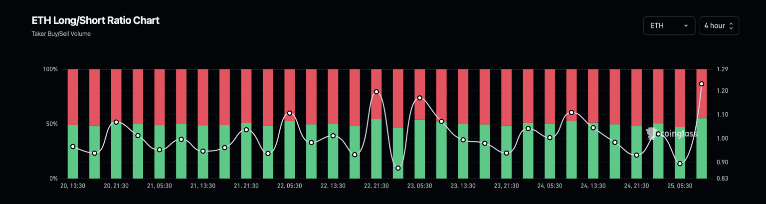 Dengan pemulihan jangka pendek dan optimisme yang berkembang, sentimen bullish meningkat di pasar derivatif Ethereum. Rasio long/short telah beralih mendukung pembeli, dengan posisi long sekarang menyusun 55% dari total kontrak selama empat jam terakhir. Ini membawa rasio ke 1.2287, menunjukkan meningkatnya taruhan bullish. Selain itu, minat terbuka Ethereum dalam derivatif telah meningkat sebesar 3,21% menjadi $21,75 miliar, disertai dengan tingkat pendanaan positif sebesar 0,0026%.