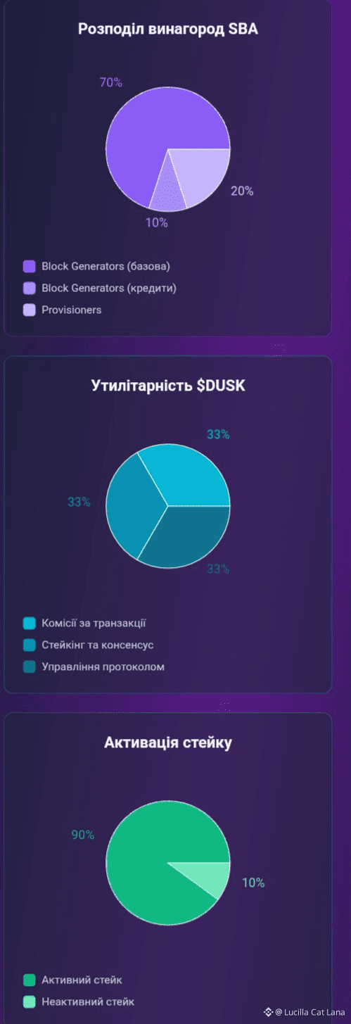 Розмірковуючи про економічну модель стейкінгу, розумію, наскільки вона важлива для довгострокової стабільності мережі. Мінімальний поріг входу — 1000 $DUSK, що робить участь у консенсусі доступною для середніх власників токенів, а не лише для китів. Період дозрівання стейку — лише 4320 блоків, приблизно 12 годин, після чого починаєш отримувати винагороди. Це набагато швидше, ніж у багатьох конкурентів, де треба чекати тижнями. Винагороди розподіляються імовірнісно залежно від розміру стейку відносно загального обсягу застейкованих токенів у мережі — чим більший твій внесок, тим частіше отримуєш нагороди. Але найцікавіше — це механізм слешингу, який карає лише за реальні порушення: підтвердження невалідних блоків чи офлайн вузли. Це не довільна конфіскація, а справедлива система, яка забезпечує безпеку без надмірної репресивності.
