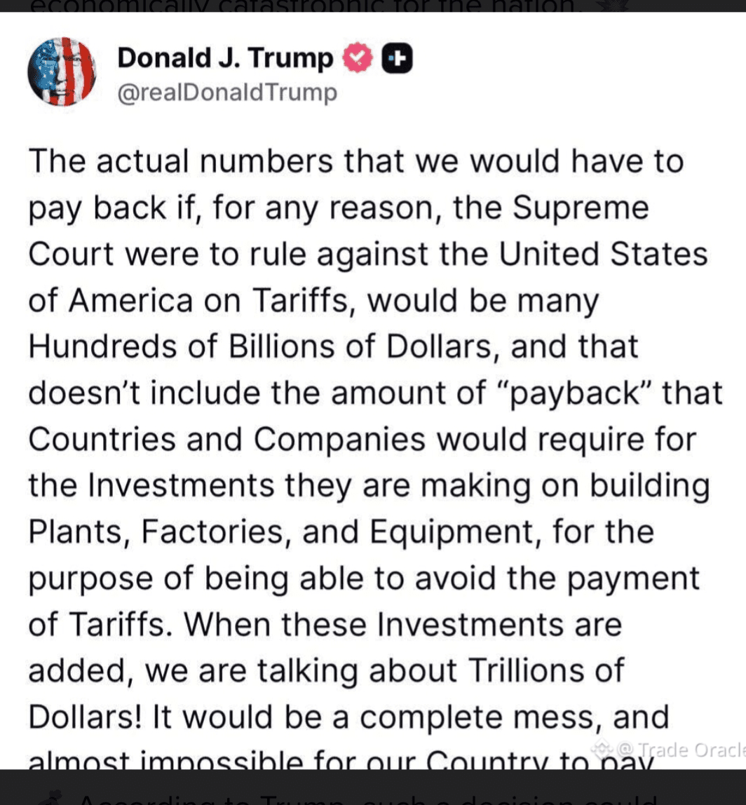 🇺🇸 Amerika Serikat mungkin sedang menuju badai keuangan serius. Mantan Presiden Donald Trump telah memberikan peringatan tegas: jika Mahkamah Agung AS membatalkan struktur tarif saat ini, dampaknya bisa sangat merugikan bagi ekonomi negara.