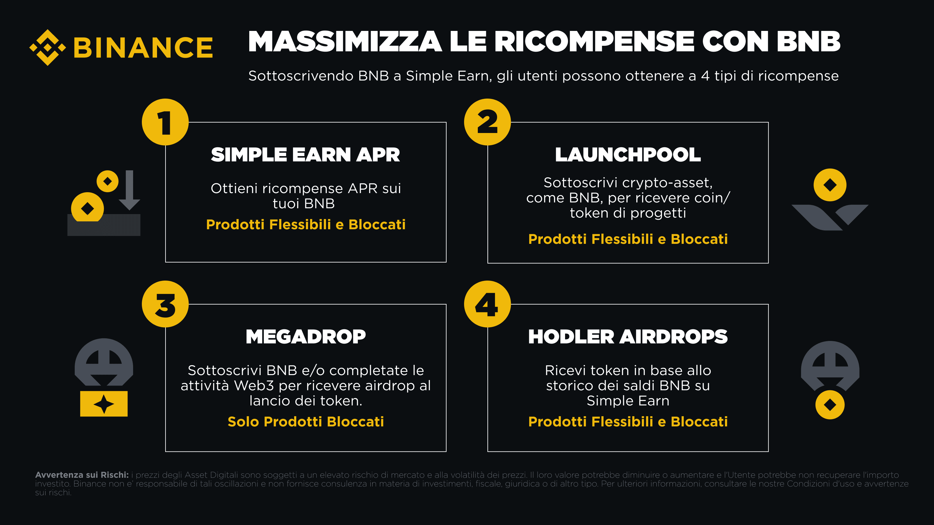 Sapevi che sottoscrivendo BNB a Simple Earn ti qualifichi anche per ricompense aggiuntive attraverso altri tre meccanismi: Launchpool, Megadrop e airdrop HODLer? Queste opportunità ti consentono di massimizzare le tue ricompense in BNB e sono progettate per essere accumulate, offrendo molteplici vantaggi contemporaneamente.