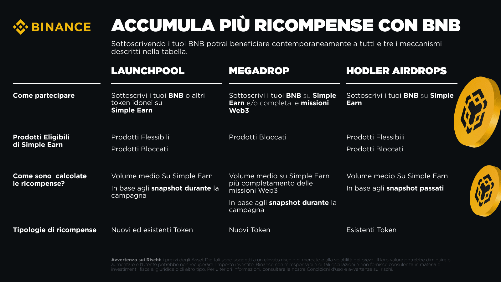 Per aiutarti a comprendere le diverse opportunità disponibili con BNB su Binance, ecco un riepilogo di Launchpool, Megadrop e gli airdrop HODLer — tutti accessibili contemporaneamente, sottoscrivendo BNB su Simple Earn!