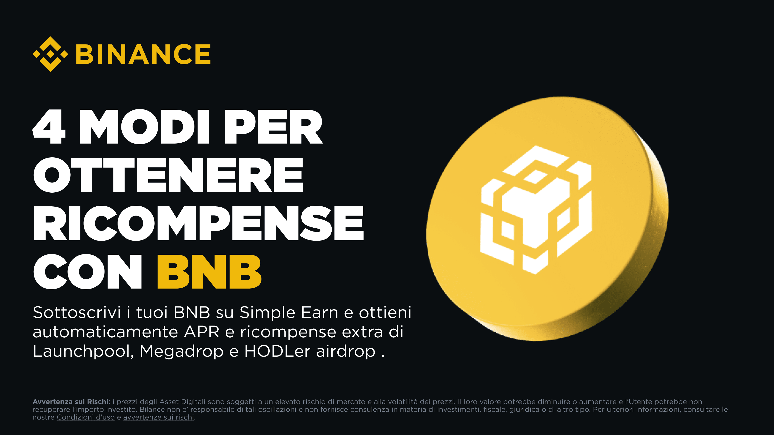 Avvertenza sui rischi: I prezzi delle crypto sono soggetti a un elevato rischio di mercato e alla volatilità. Dovresti investire unicamente nei prodotti che conosci bene e dei quali conosci i rischi associati. Dovresti tenere ben presente la tua esperienza di investimento, la situazione finanziaria, gli obiettivi di investimento, la tolleranza al rischio e consultare un consulente finanziario indipendente prima di effettuare qualsiasi investimento. Il presente materiale non deve essere interpretato come una consulenza finanziaria. Le prestazioni passate non sono un indicatore affidabile delle performance future. Il valore del tuo investimento può scendere così come può salire e potresti non riavere l'importo investito. Sei l'unico responsabile delle tue decisioni di investimento. Binance non è responsabile di nessuna perdita che potresti subire. Per maggiori informazioni, consulta i nostri Termini di utilizzo e l'Avvertenza sui rischi.