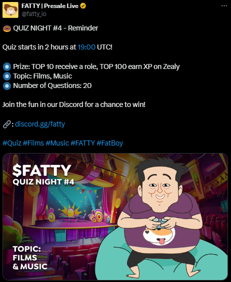 Il FATTY Token Quiz Night 4 è previsto per il 30 luglio alle 19:00 UTC. Questo quiz si svolgerà sul server Discord e conterrà 20 domande incentrate su film e musica. I partecipanti possono vincere premi, con i primi 10 vincitori che ricevono un ruolo speciale e i primi 100 partecipanti che guadagnano XP su Zealy, un gateway per unirsi a varie comunità, partecipare ad attività e guadagnare premi.