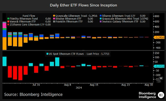 Gli ETF Spot Ether hanno registrato un deflusso netto di 47,4 milioni di $ martedì. Ha iniziato il primo giorno di negoziazione del mese con deflussi mai visti nelle settimane precedenti. Il prezzo di Ethereum sta lottando per raggiungere un nuovo ATH e attualmente viene scambiato sotto i 2.400 $, in calo del 4% nelle ultime 24 ore.