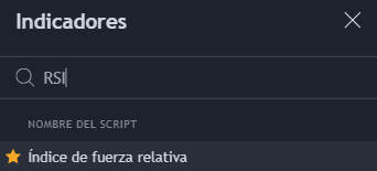 Come abbiamo mostrato in precedenza, andiamo su Indicatori tecnici. Digita RSI nella barra di ricerca e seleziona "Indice di forza relativa" per aggiungerlo al grafico. Questo indicatore ti consentirà di identificare se il prezzo del Bitcoin è a livelli di ipercomprato o ipervenduto; non è necessario modificare le impostazioni predefinite.