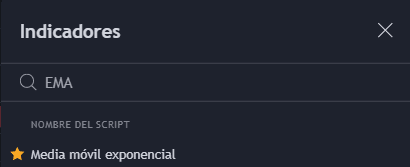 Nella casella di ricerca dell'indicatore ho digitato "EMA". Successivamente, seleziona l'opzione "Media mobile esponenziale" per aggiungerla al grafico.
