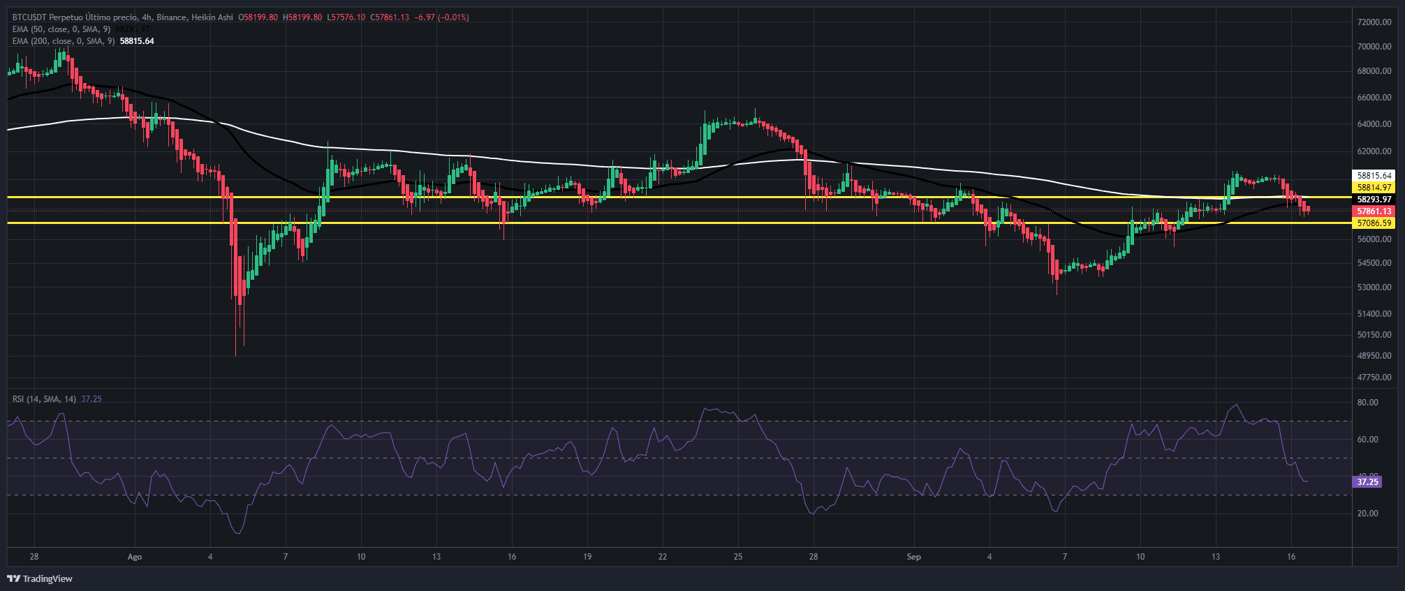 In questo grafico a 4 ore (uso questo intervallo di tempo per rendere il post più dinamico), utilizziamo le EMA a 50 e 200 giorni, insieme all'RSI che abbiamo impostato in precedenza. La media mobile esponenziale a 200 giorni a $ 58.815 funge da importante resistenza, mentre il supporto immediato si attesta a $ 57.086. Se il prezzo non riesce a superare la resistenza, potremmo assistere a una correzione verso il supporto. L'RSI è a 37,25, il che indica che il mercato è vicino ai livelli di ipervenduto, il che potrebbe annunciare una ripresa. Se il prezzo non riesce a rompere la resistenza a $ 58.815, potremmo assistere a un movimento al ribasso verso il supporto a $ 57.086. ✨ Nota importante: nell'analisi tecnica abbiamo utilizzato gli EMA e l'RSI configurati in precedenza. Tuttavia, gli indicatori sono tanti quanti sono i gusti, ma in molti casi vale la regola del "meno è meglio". Per un'analisi efficace è fondamentale che il grafico sia semplice e chiaro.