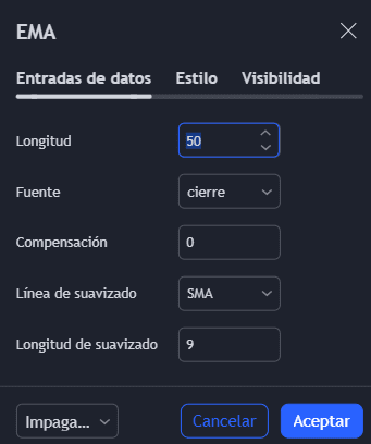 Fare clic sull'icona "Opzioni impostazioni" per regolare il periodo EMA.