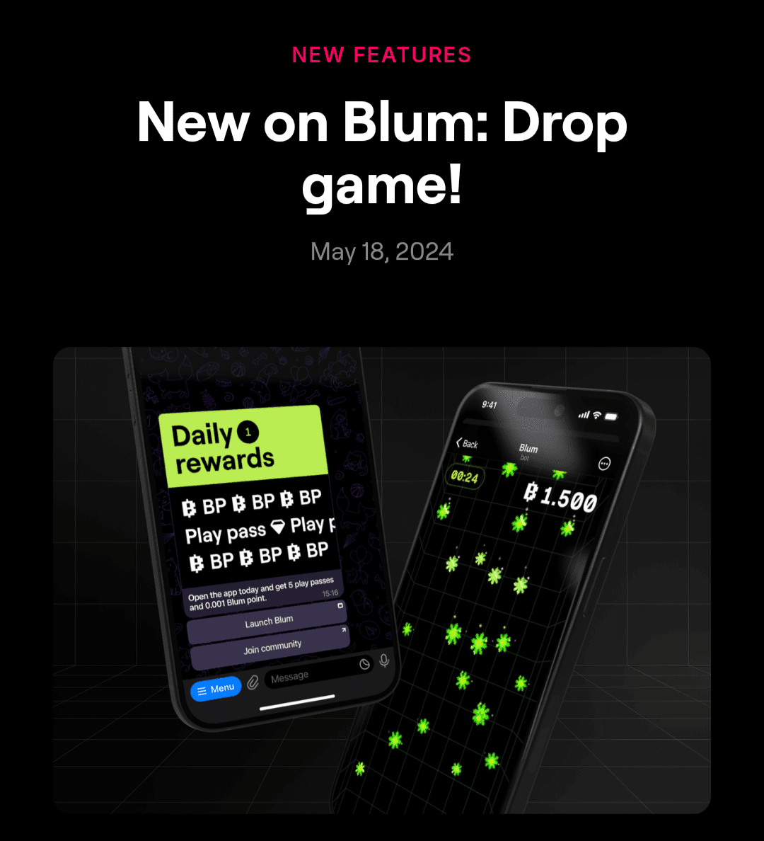 2. Guadagna punti: gli utenti accumulano punti Blum (BP) accedendo quotidianamente all'app. I punti aumentano durante la prima settimana e possono essere utilizzati in giochi come Drop Game, dove catturare oggetti che cadono guadagna punti extra.