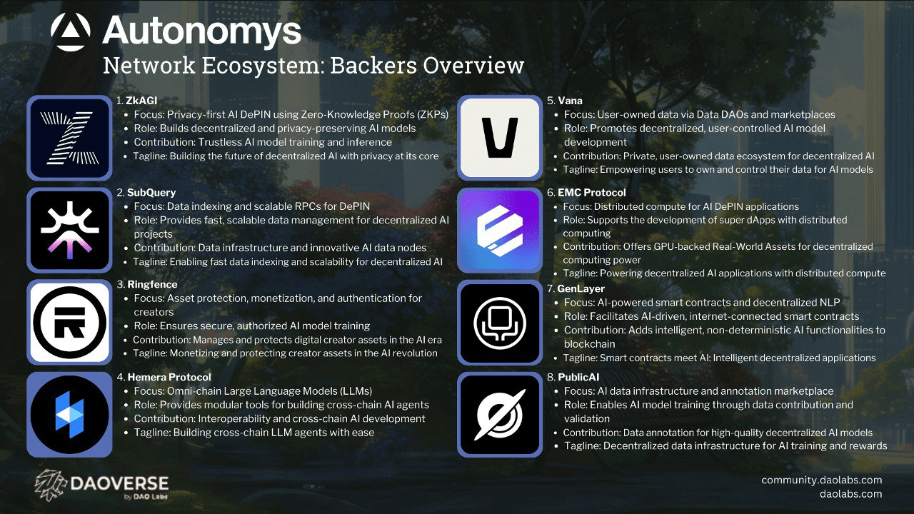 Queste aziende supportano collettivamente l'ecosistema Autonomys contribuendo con la loro esperienza in blockchain, IA, infrastrutture decentralizzate e gestione dei dati. La loro presenza come sostenitori convalida la robustezza del progetto Autonomys e aiuta a promuovere un ecosistema di IA decentralizzata che sia scalabile, sicuro e guidato dalla comunità.