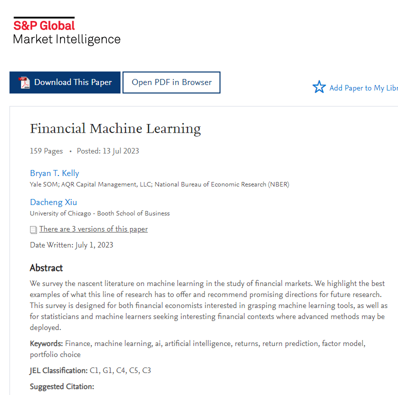 Nel loro articolo intitolato “Financial Machine Learning”, Bryan T. Kelly e Dacheng Xiu esplorano l’applicazione delle tecniche di machine learning nello studio dei mercati finanziari. Pubblicato nel luglio 2023, questo articolo fornisce una panoramica della letteratura emergente sull’argomento, evidenziando gli esempi più promettenti e proponendo indicazioni per la ricerca futura. Destinato sia agli economisti finanziari che desiderano comprendere gli strumenti di machine learning, sia agli statistici e agli specialisti dell'apprendimento automatico che cercano contesti finanziari interessanti per implementare metodi avanzati, questo articolo si posiziona come un riferimento essenziale nel campo. Gli autori citano numerosi lavori precedenti a supporto delle loro analisi e raccomandazioni, contribuendo così ad arricchire il dibattito accademico e pratico sull’integrazione dell’intelligenza artificiale nella finanza.