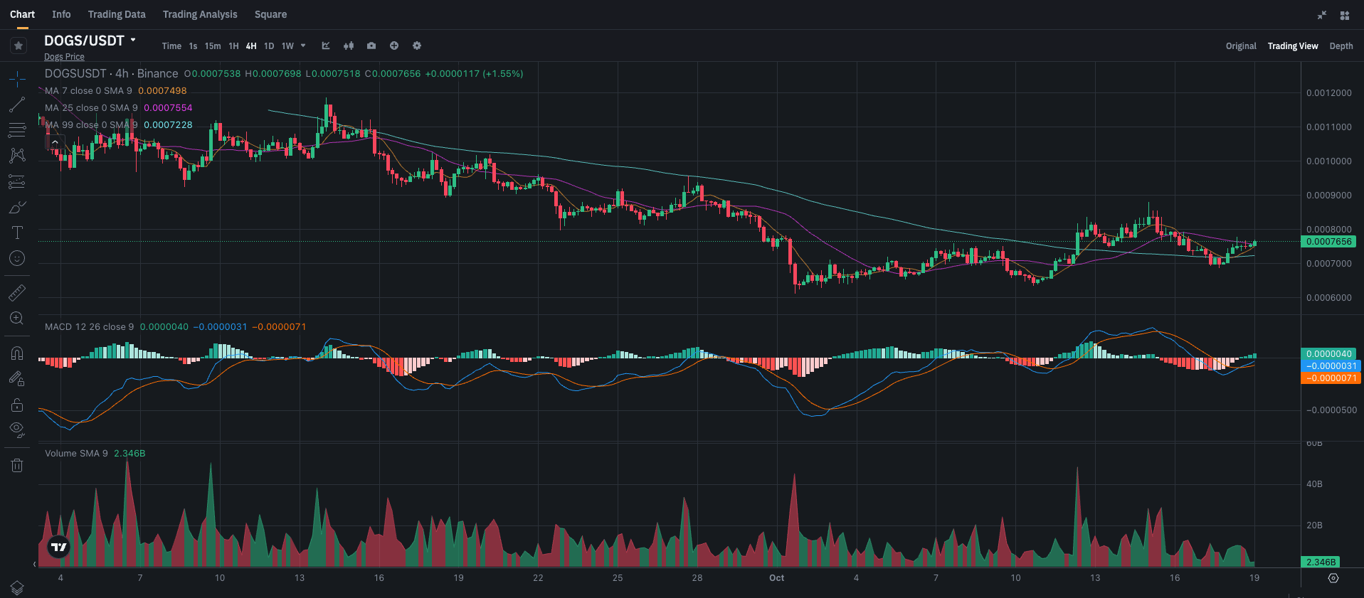 Osservando l'attuale price action di DOGS, lo vediamo oscillare intorno a 0,00007656. Sebbene non abbia fatto mosse esplosive ultimamente, ci sono diversi segnali che meritano attenzione. Immergiamoci nelle medie mobili, MACD e nei trend di volume per avere un quadro più chiaro.