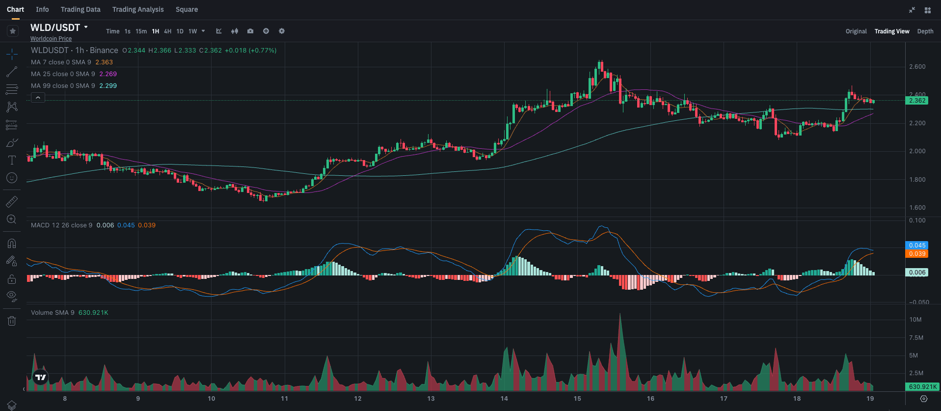 Attualmente, WLD è scambiato a 2,362, mostrando segnali di ripresa dopo un calo significativo all'inizio di questo mese. Il grafico sembra promettente, con alcuni indicatori chiave che puntano verso un potenziale rialzista. Ma prima di entusiasmarci troppo, analizziamo le medie mobili, MACD e i trend di volume per valutare cosa sta realmente accadendo.