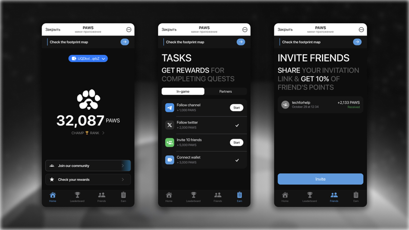 PAWS è una nuova mini-app su Telegram che premia gli utenti per aver precedentemente partecipato ad altri airdrop. L'applicazione PAWS analizza il tuo account per la partecipazione a lanci di altri progetti ($NOT $DOGS >$HMSTR ). In base alla tua attività al loro interno, ti verranno assegnate monete $PAWS con lo stesso nome.