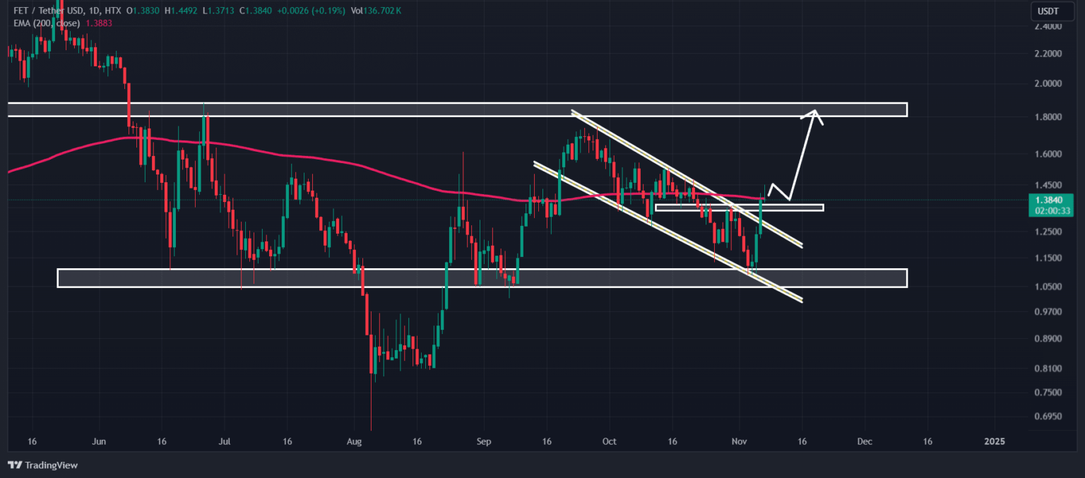 Negli ultimi due giorni, il FET è aumentato di oltre il 25%, portando ad un breakout e alla chiusura della candela giornaliera al di sopra di un modello di canale discendente.