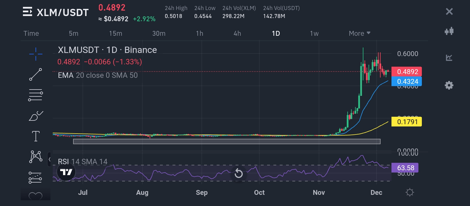 XLM è stato su una traiettoria ascendente stellare negli ultimi mesi, spinto da un'adozione crescente e ottimismo di mercato. L'impennata da livelli sotto $0.20 a quasi $0.60 evidenzia una forte fiducia e domanda degli investitori. Tuttavia, la rapida ascesa ha anche portato a un certo consolidamento, con i trader che bloccano i profitti vicino alla zona di $0.50.