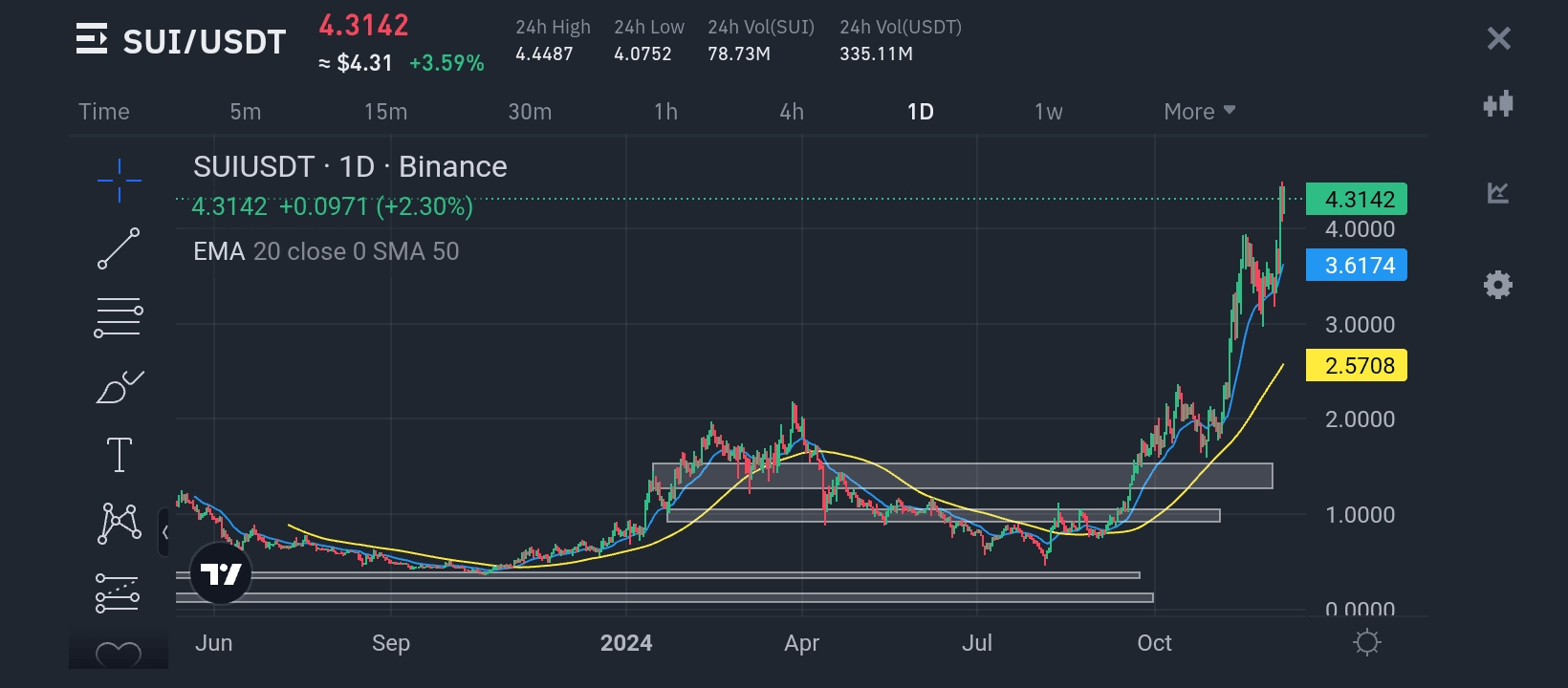 Il token SUI sta mostrando un forte slancio rialzista, rompendo i precedenti livelli di resistenza e scambiando significativamente al di sopra delle medie mobili chiave. Ecco una ripartizione dettagliata: