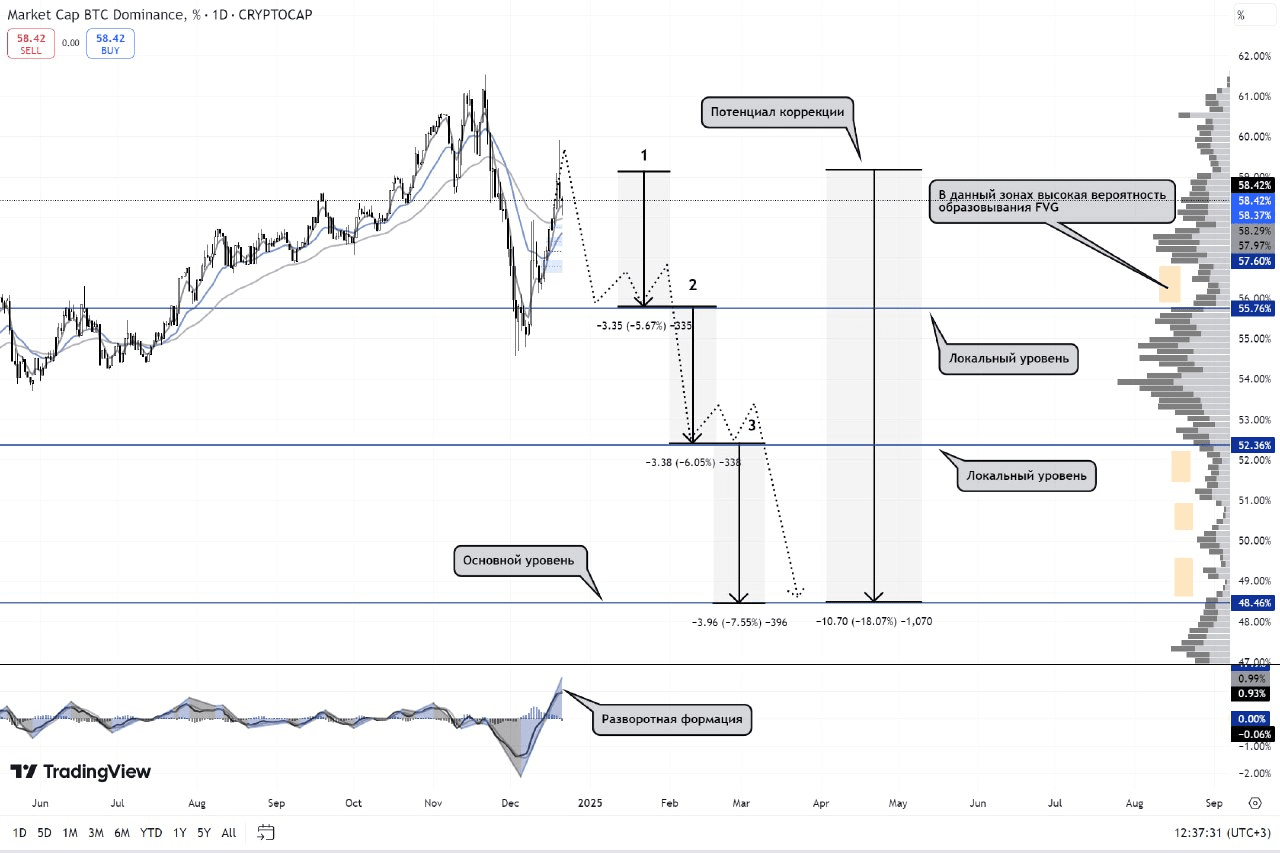 La dominanza di $BTC sul grafico mostra segni dell'inizio di un movimento correttivo, ciò è confermato dalla formazione di inversione del MACD.