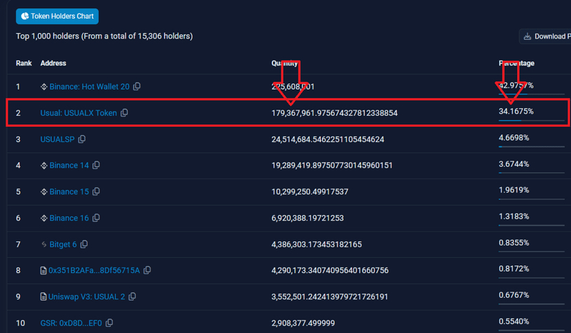 L'ecosistema $USUAL mostra un'attività di staking robusta, con oltre il 34% dell'offerta circolante bloccato nello staking per $USUALx. Il restante 65,83% è attivamente in circolazione nel mercato, riflettendo un equilibrio sano tra staking e liquidità.