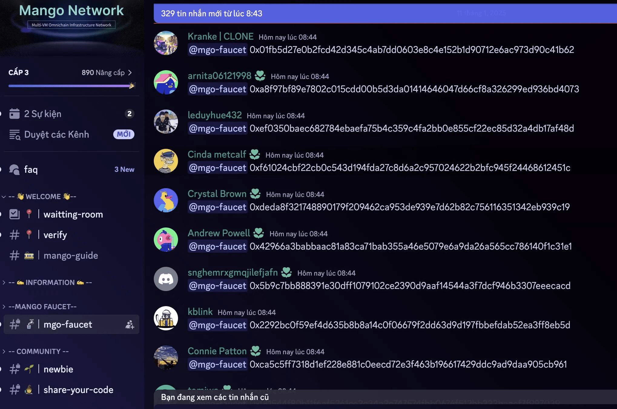Unisciti al Discord di Mango Network. Devi chattare fino a raggiungere il Livello 3 e ottenere il ruolo M1 per accedere al canale #mgo-faucet.