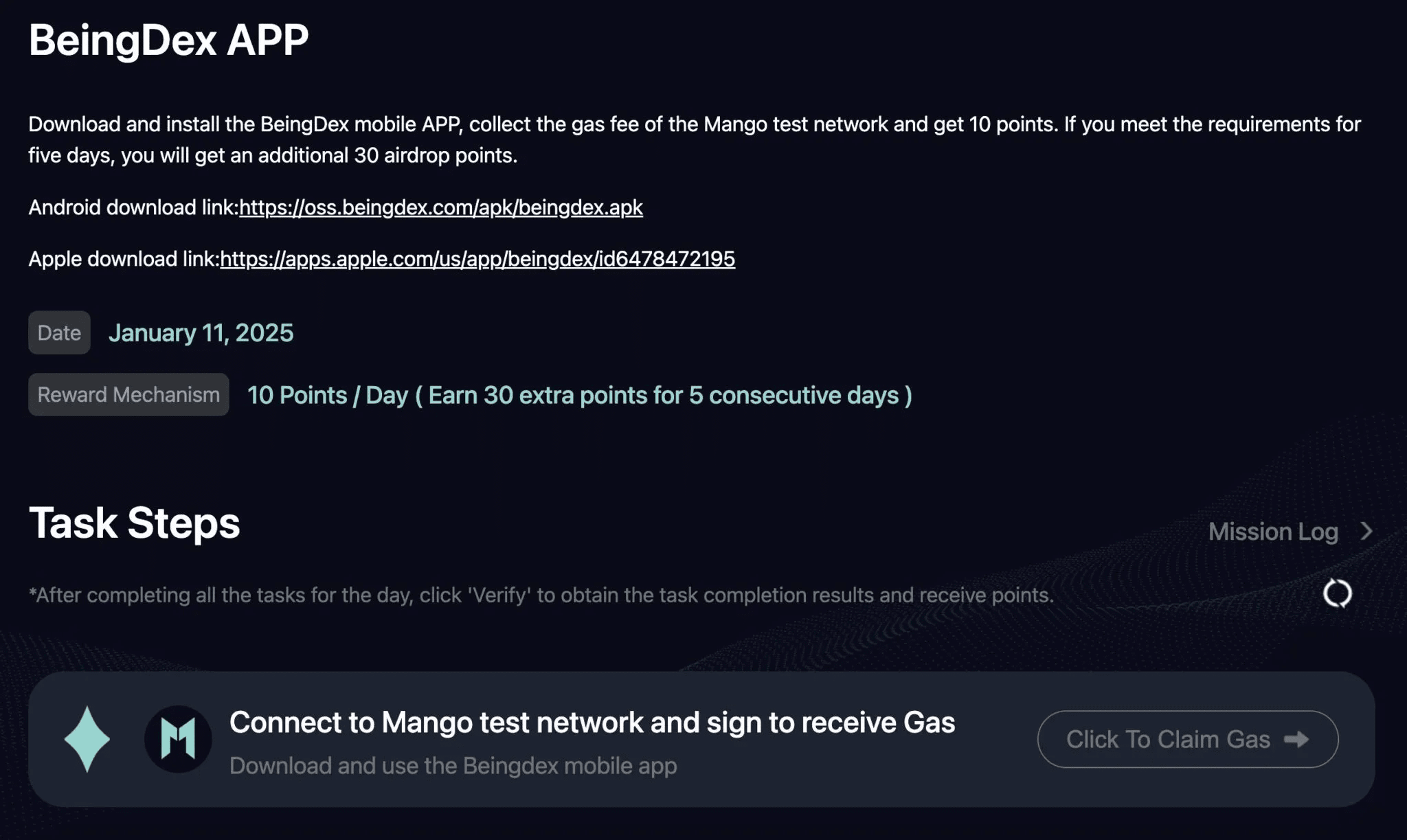 Dopo aver scaricato, importa il tuo wallet Mango nell'app Being Dex. Poi, torna alla pagina del compito e clicca Clicca per richiedere Gas.