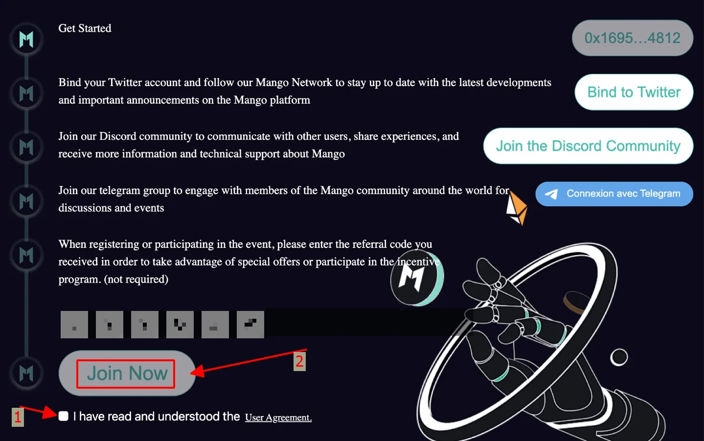Passo 2: Visita il sito di Mango Network, collega il wallet Mango che hai appena creato e inserisci il Codice: xNKiy5.