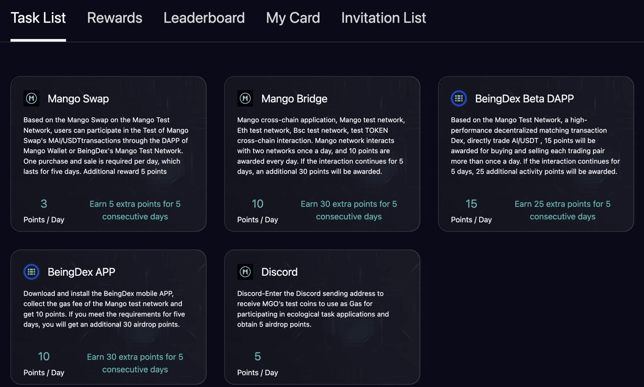 Passo 4: Vai alla sezione Elenco Compiti e continua a completare i compiti per interagire con DApp sul Mango Testnet.
