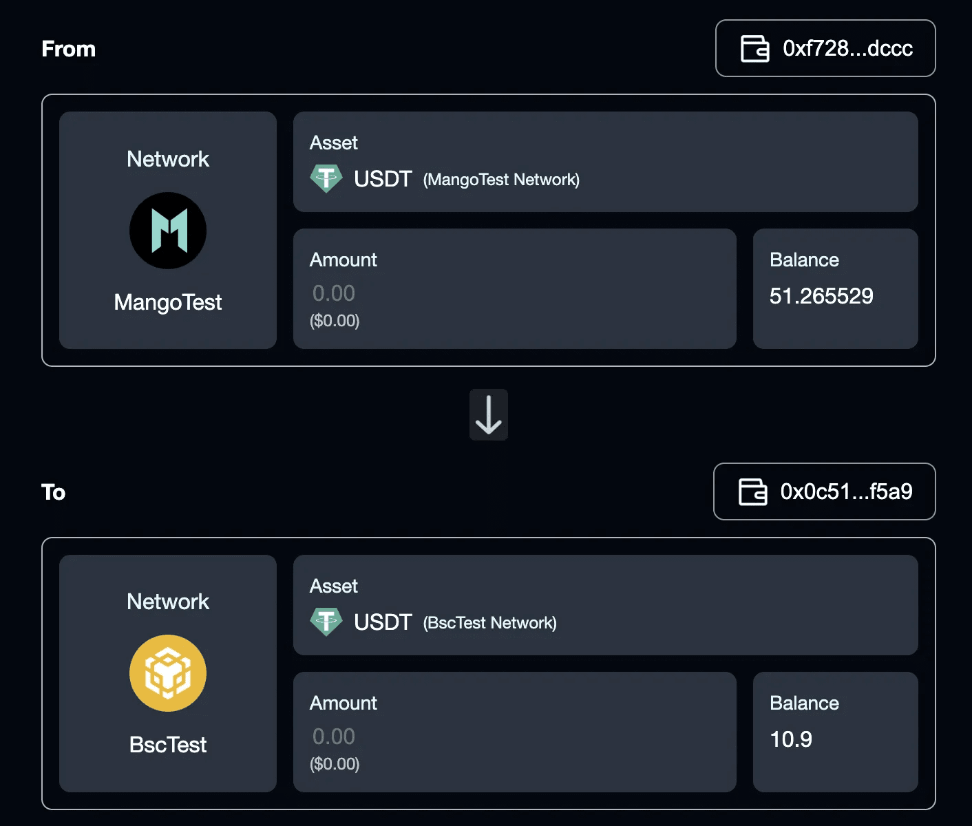 Visita Mango Bridge e esegui trasferimenti cross-chain tra il Mango Testnet e altre reti come BSC e ETH Testnet per completare il compito.