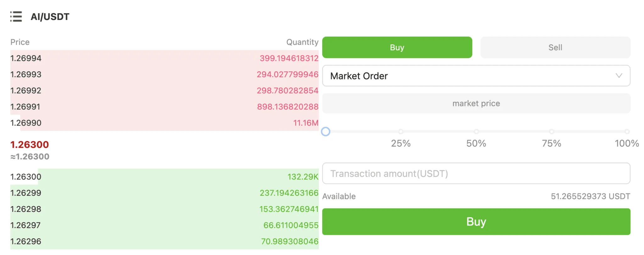 → Usa le funzionalità di Acquisto e Vendita per la coppia di trading AI/USDT. Si consiglia di utilizzare l'Ordine di Mercato per transazioni più veloci.