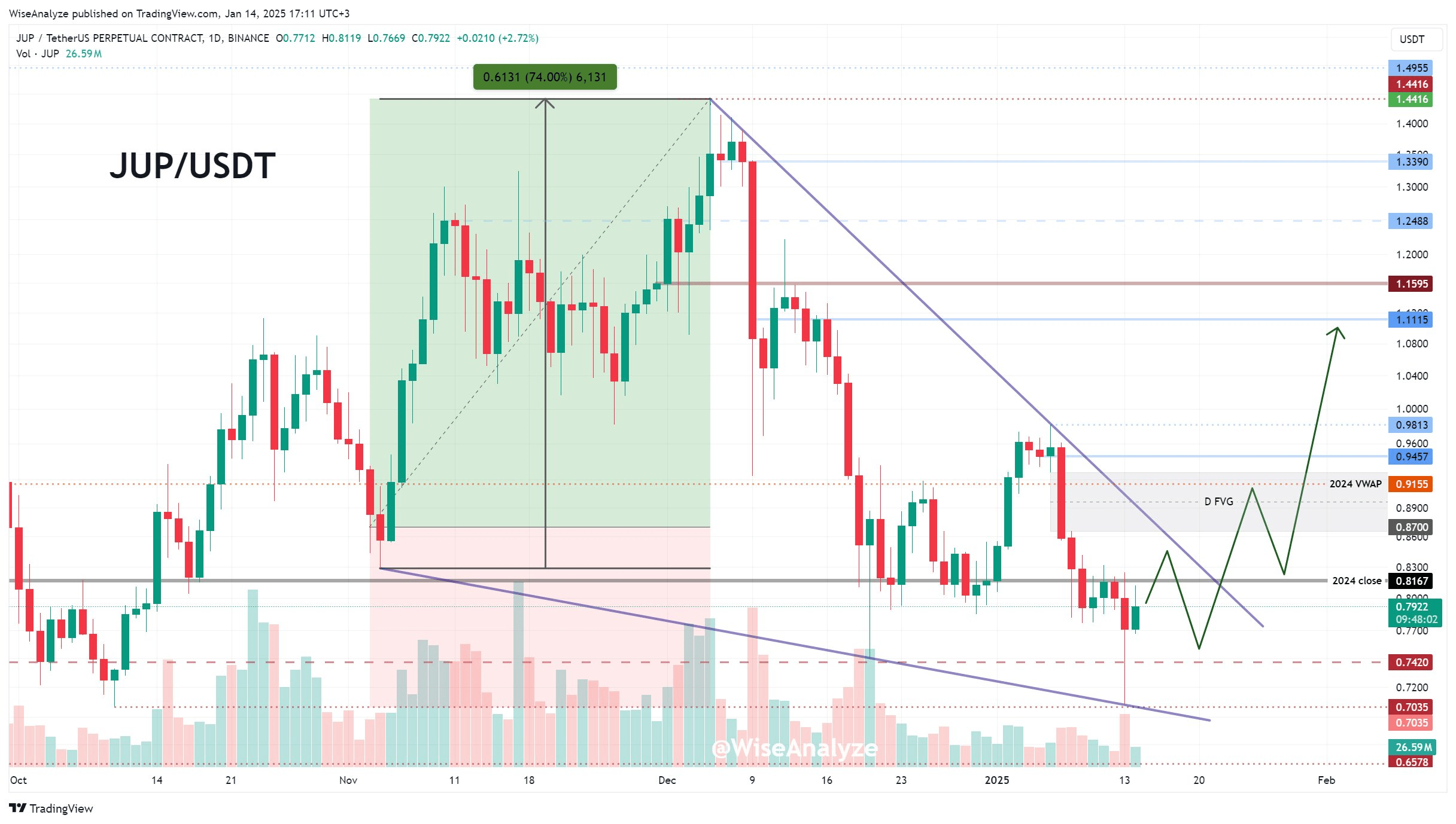 โข $JUP sta guadagnando slancio, scambiando a $0.79, ma il suo momentum รจ legato al rally piรน ampio del mercato.