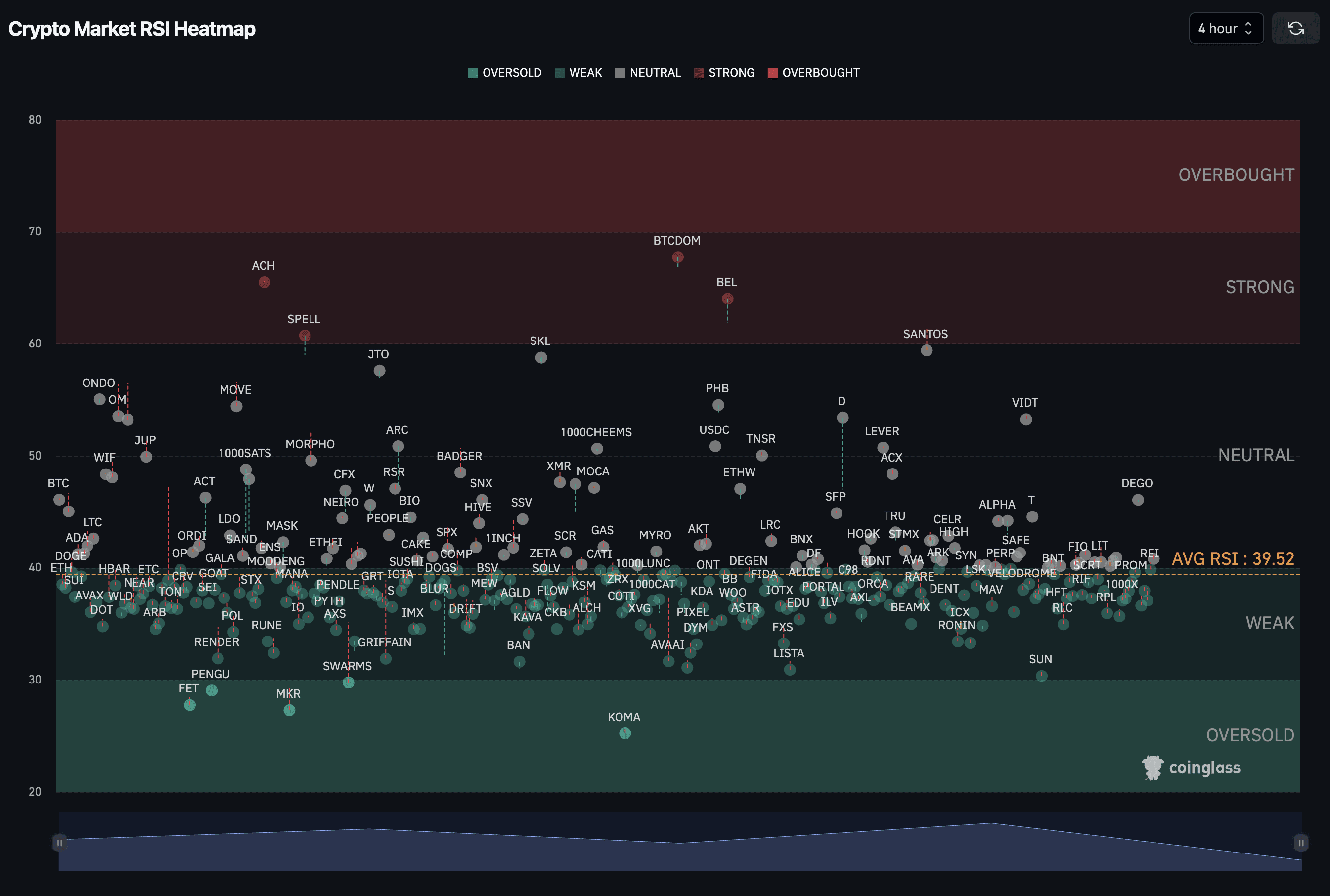 RSI Heatmap su Coinglass è uno strumento potente che aiuta i trader ad analizzare rapidamente le dinamiche di mercato su diversi intervalli di tempo. Utilizzando la mappa termica RSI è possibile: