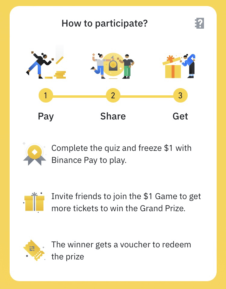 Ricorda, questo gioco offre una straordinaria opportunità per migliorare potenzialmente la tua esperienza crittografica. Partecipa oggi stesso al Gioco Binance Pay $1 e cogli la possibilità di una vincita significativa!