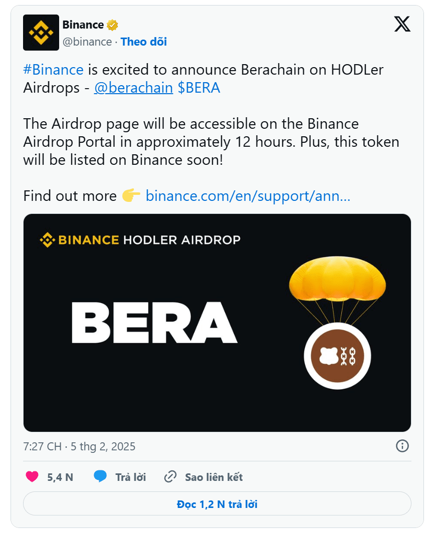 Binance, uno dei principali scambi di criptovalute, ha selezionato Berachain come 7° progetto sulla sua piattaforma di airdrop HODLer. Gli utenti che hanno partecipato al programma "BNB to Simple Earn" di Binance dal 22 al 26 gennaio riceveranno una parte di un totale di 10 milioni di token BERA airdroppati.