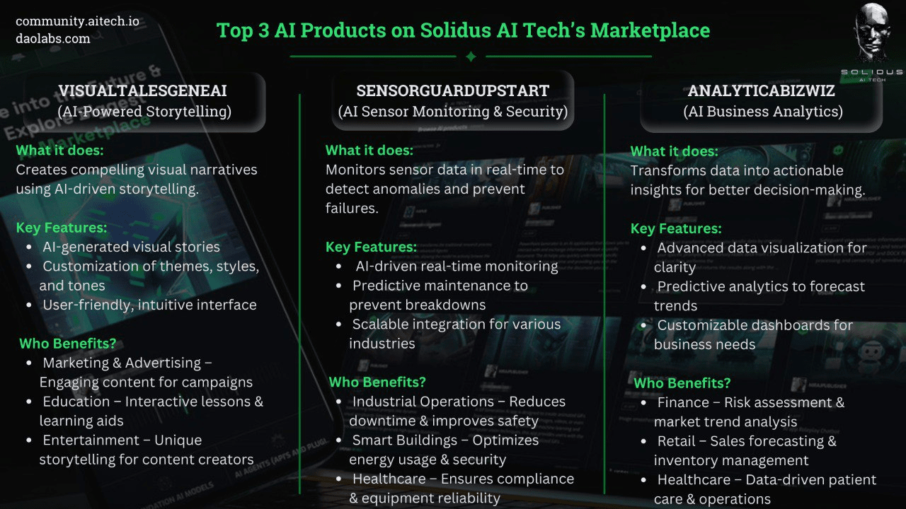 L'Intelligenza Artificiale (IA) sta trasformando le industrie, offrendo soluzioni all'avanguardia per migliorare la produttività, la sicurezza e il processo decisionale. Solidus @AITECH Marketplace è in prima linea in questa rivoluzione, fornendo strumenti innovativi alimentati dall'IA che semplificano diverse operazioni aziendali. In questo articolo, esploriamo tre prodotti IA eccezionali che mostrano innovazione, funzionalità e impatto: VisualTalesGeneAI, SensorGuardUpStart e AnalyticaBizWiz.