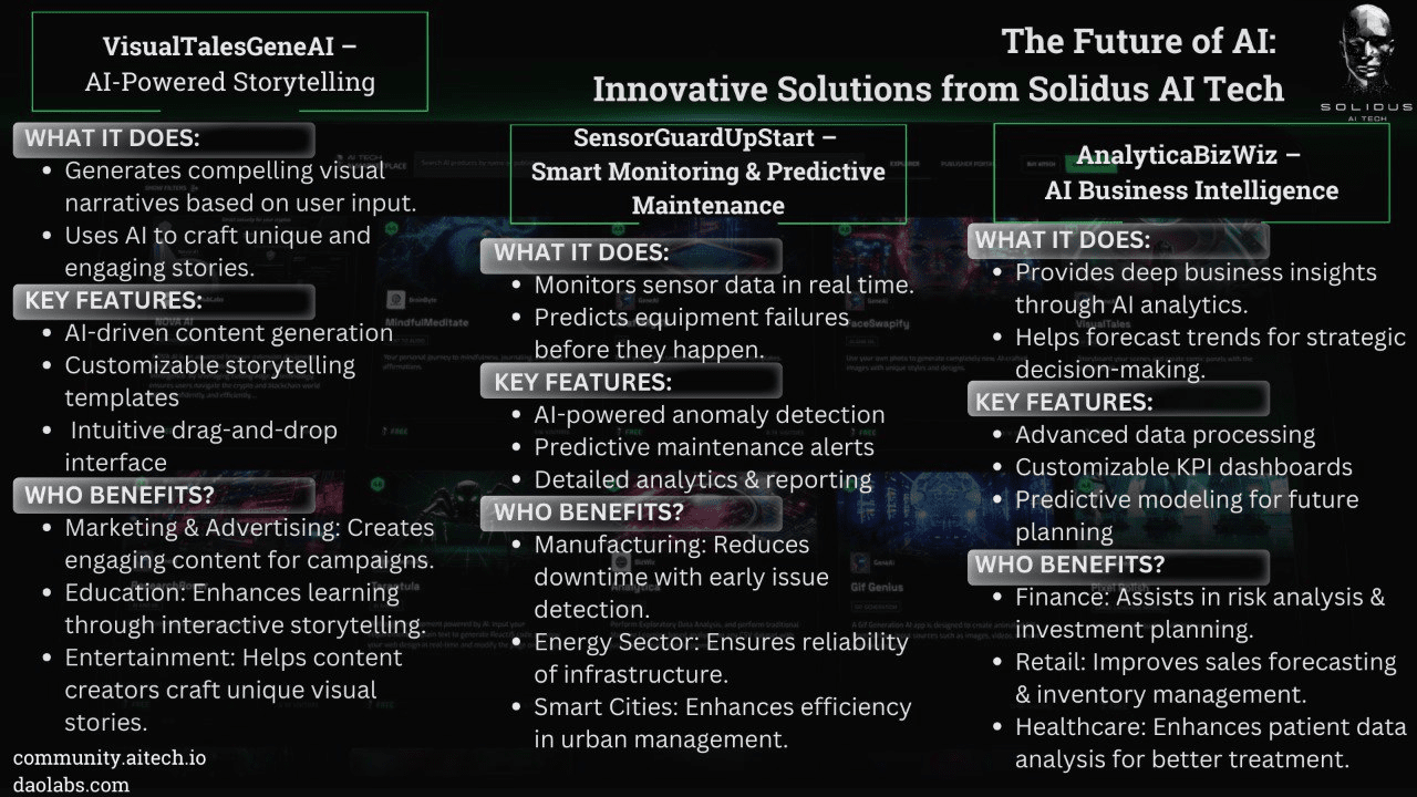 Le innovazioni offerte dal Marketplace di Solidus AI Tech evidenziano il potere trasformativo dell'IA in vari settori. Da VisualTalesGeneAI che migliora la narrazione digitale a SensorGuardUpStart che rivoluziona la manutenzione industriale e AnalyticaBizWiz che ottimizza l'intelligenza aziendale, questi prodotti stanno aprendo la strada a un futuro più intelligente e più efficiente. Le aziende e i professionisti che desiderano sfruttare il potenziale dell'IA possono esplorare queste soluzioni innovative e sbloccare nuovi livelli di produttività e innovazione.