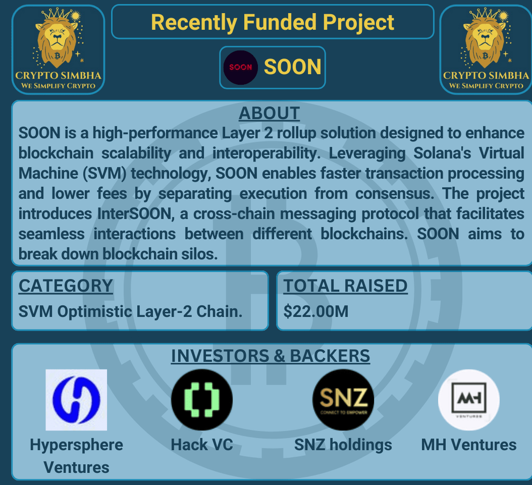 🔹Informazioni: SOON è una soluzione di rollup Layer 2 ad alte prestazioni progettata per migliorare la scalabilità e l'interoperabilità della blockchain. Sfruttando la tecnologia del Macchina Virtuale di Solana (SVM), SOON consente un'elaborazione delle transazioni più rapida e costi inferiori separando l'esecuzione dal consenso. Il progetto introduce InterSOON, un protocollo di messaggistica cross-chain che facilita interazioni senza soluzione di continuità tra diverse blockchain. SOON mira a rompere i silos della blockchain, rendendo le applicazioni multi-chain più accessibili a sviluppatori e utenti. Con la sua architettura decoupled, SOON supporta applicazioni ad alto throughput, inclusi giochi e DeFi, senza essere vincolato ai vincoli di Ethereum. Il token $SOON alimenta la governance, lo staking e le commissioni di transazione all'interno dell'ecosistema, promuovendo la decentralizzazione e il coinvolgimento della comunità. Affrontando le sfide chiave nella tecnologia blockchain, SOON si impegna a raggiungere l'adozione di massa e a creare un ambiente blockchain più efficiente e interconnesso.🚀🌐