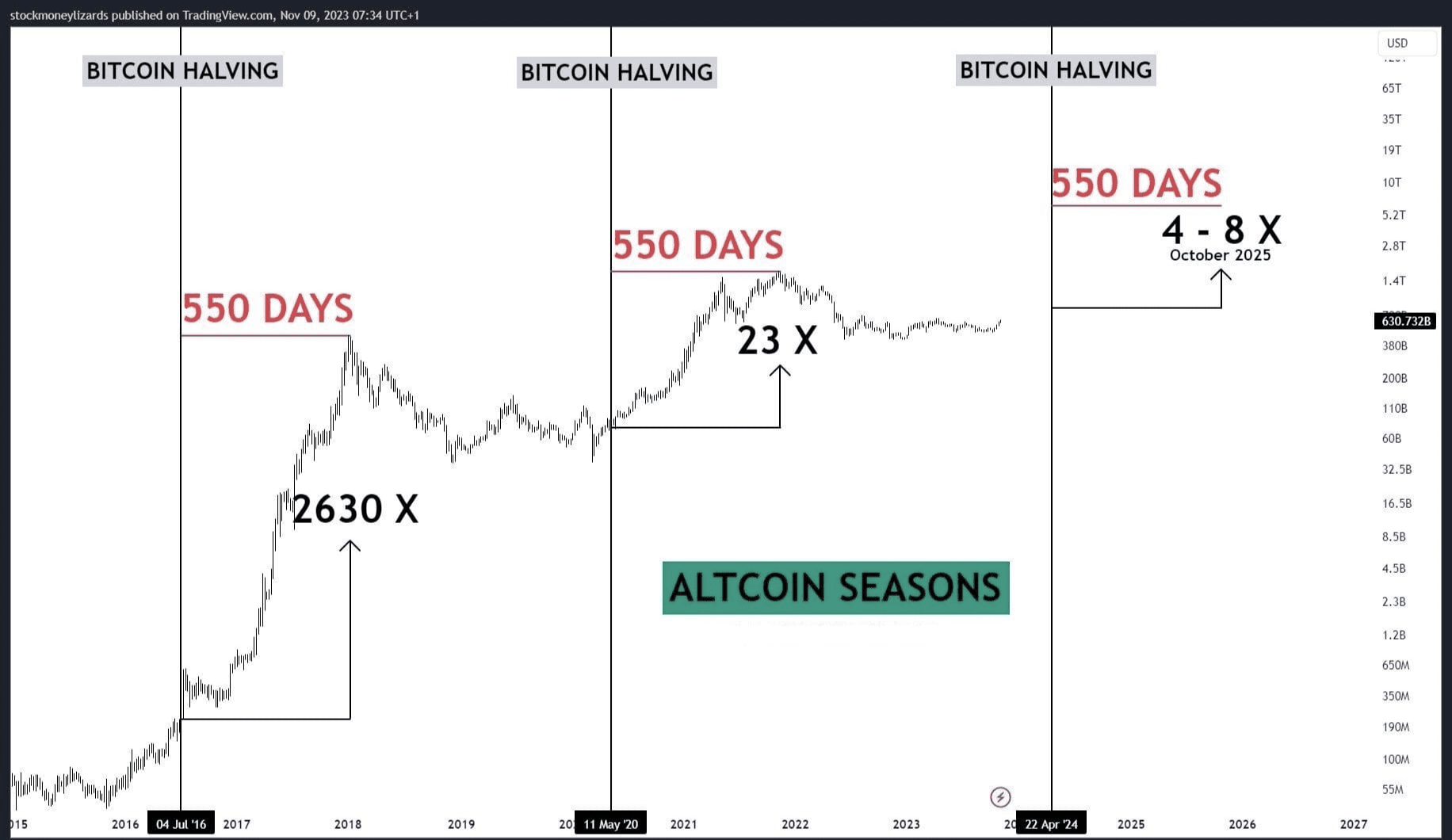 Guardando i mercati rialzisti passati, le stagioni delle altcoin seguono un chiaro modello dopo gli halving di Bitcoin: